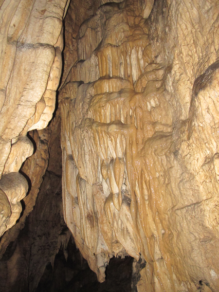 Wenn kalkgesättigtes Wasser an der Wand herabläuft, kann es Kalk absetzen, und es bildet sich Wandsinter. Dort, wo es langsamer fliesst, setzt sich mehr Kalk ab, und das Wasser fliesst dadurch noch langsamer und setzt noch mehr Kalk ab. Dabei bildet sich eine stufenartige Vorwölbung, unter der sich Sinterlamellen bilden. Während sich das Wasser auf der Vorwölbung in die Breite verteilt und sogar kleine Sinterbecken bilden kann, sammelt es sich unterhalb in den sich vereinigenden Lamellen wieder. Wenn die Vorwölbung gross genug geworden ist, so dass das Wasser abtropft, anstatt an der Lamelle herunterzulaufen, dann bilden sich Sinterfahnen oder Stalaktiten, denen oft Stalagmiten entgegenwachsen.